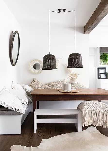 Hình ảnh sắc nét đươc chụp lại toàn cảnh một không gian sinh hoạt chung với tông màu trắng là màu chủ đạo. Bước chân vào không gian này điểm đầu tiên gây sự chú ý đó là bộ bàn ghế khung gỗ với chiếc bàn màu nâu nhẹ cùng những chiếc ghế màu trắng sáng kết hợp với một vài chiếc gối trang trí mang lại sự ấn tượng và độc đáo. Hai chiếc đèn trang trí với thiết kế mới lạ cũng góp phần làm nên sự sinh động cho không gian này.